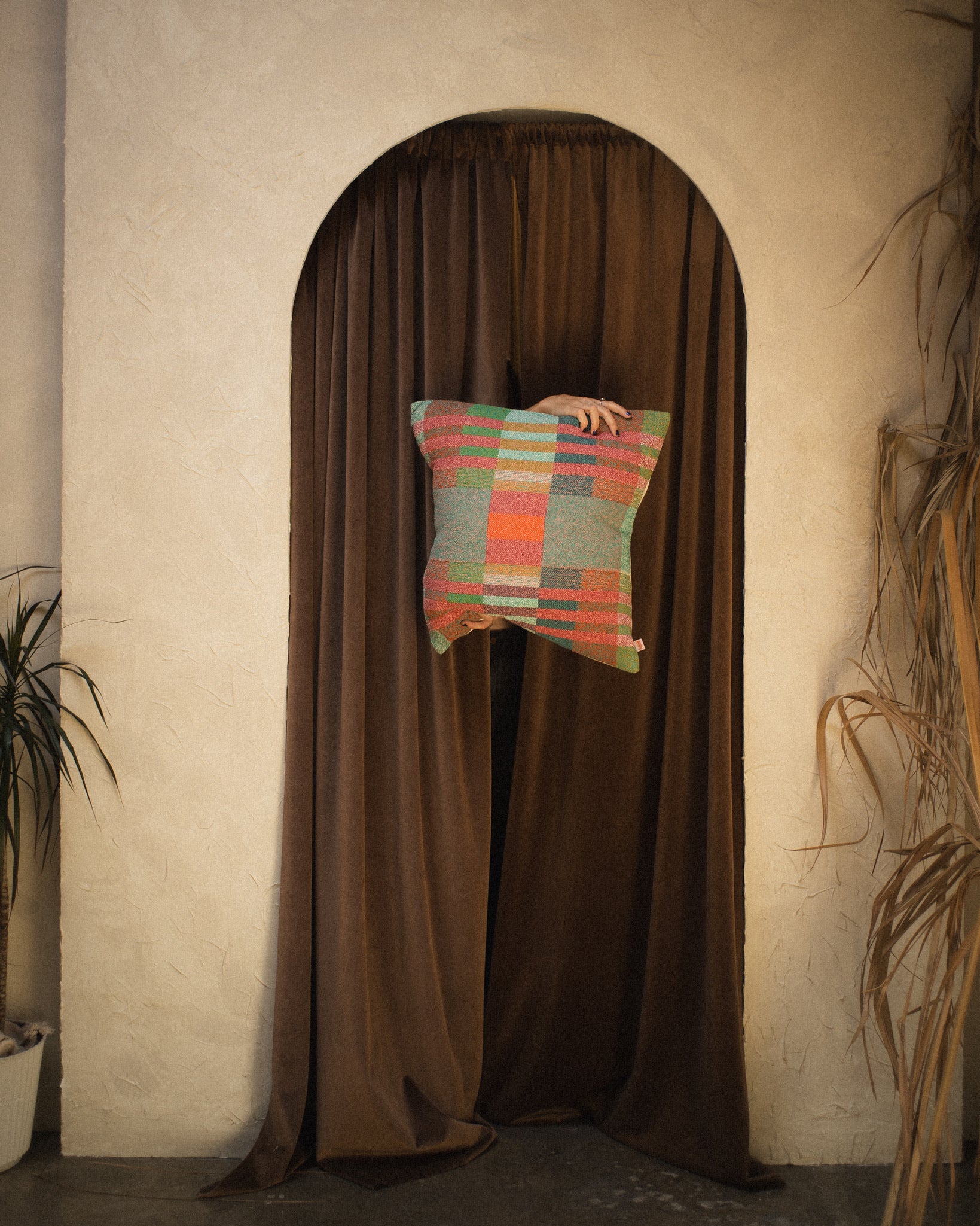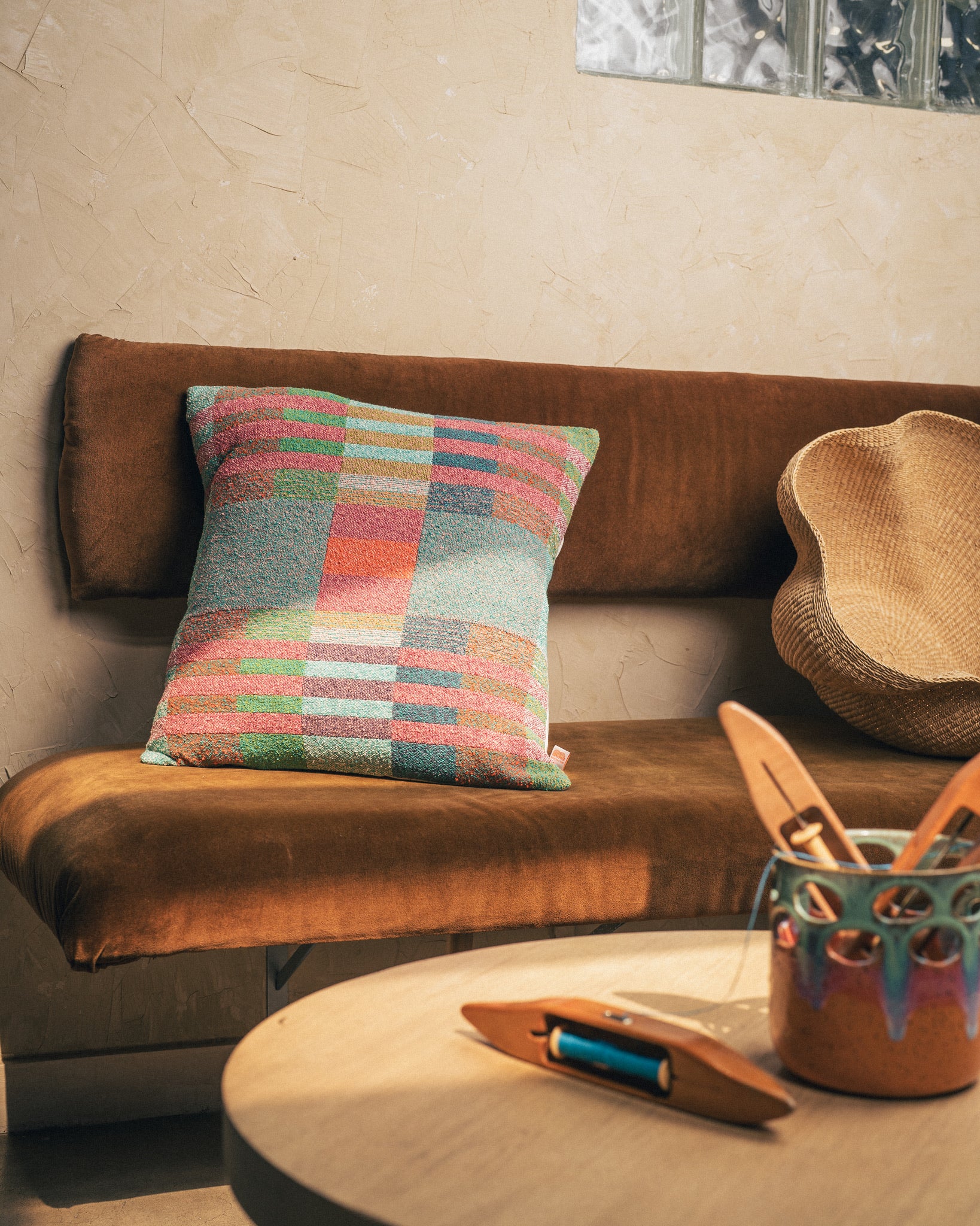 All pillow fronts are handwoven by Berly Sampson. Sewn together by Sew Co. Pillows are approximately 20x20 with a cream colored envelope backing.