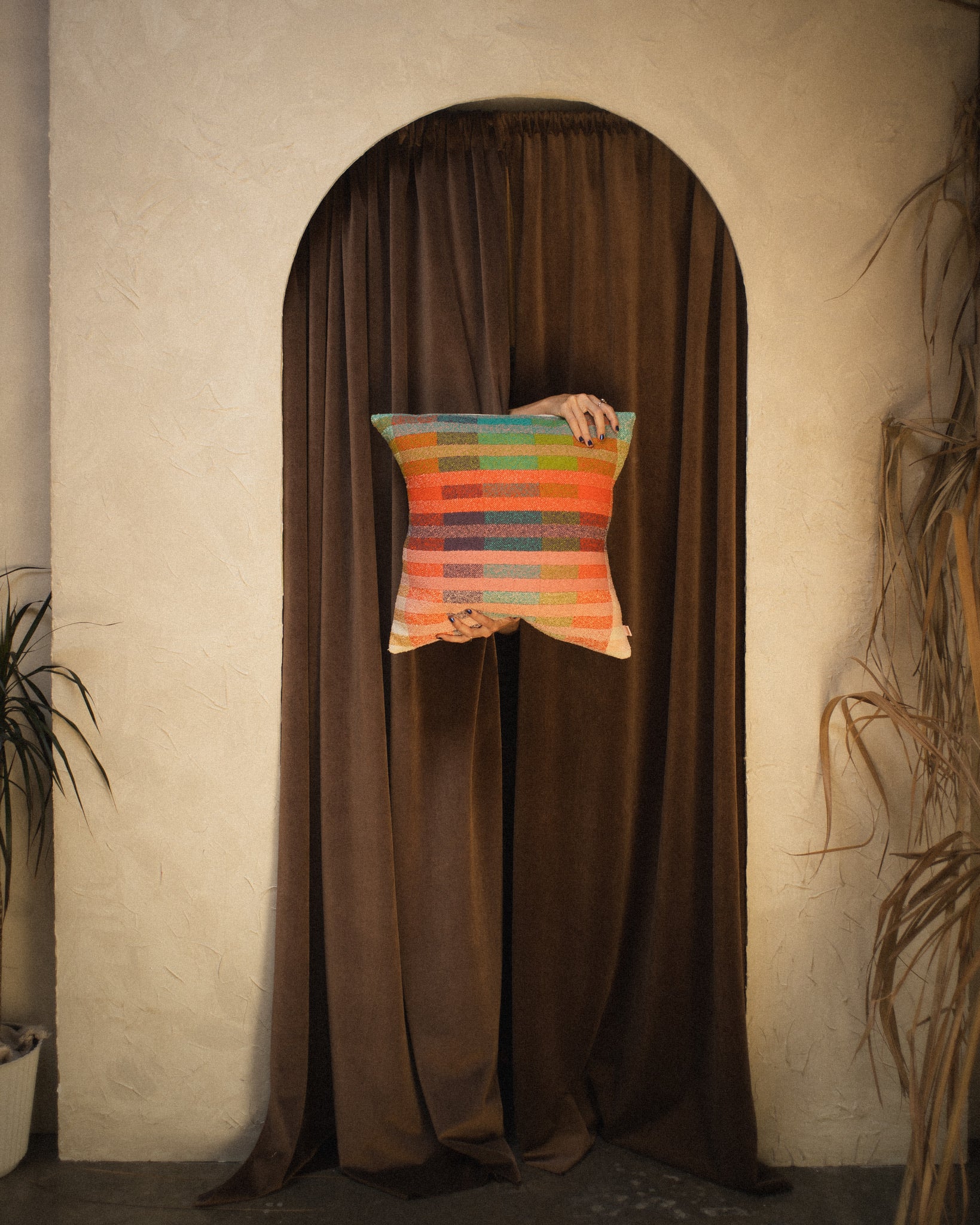 All pillow fronts are handwoven by Berly Sampson. Sewn together by Sew Co. Pillows are approximately 20x20 with a cream colored envelope backing.