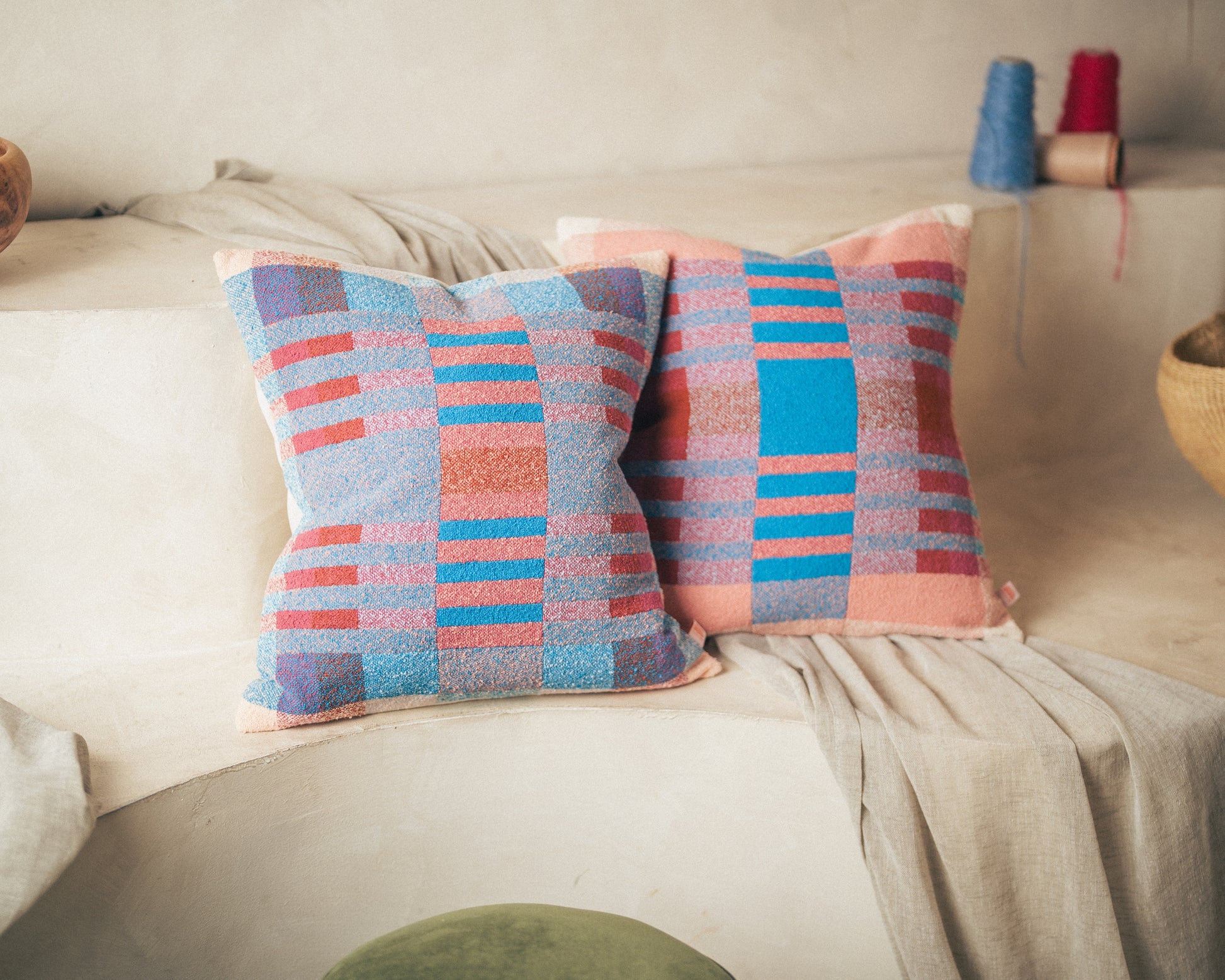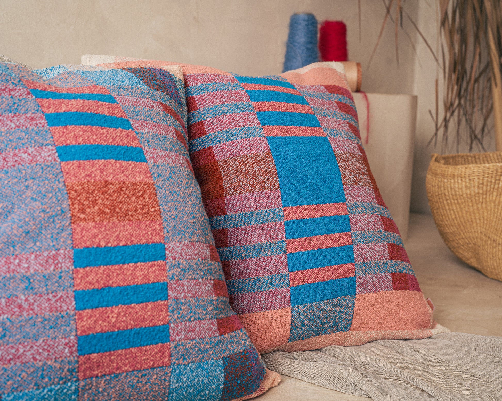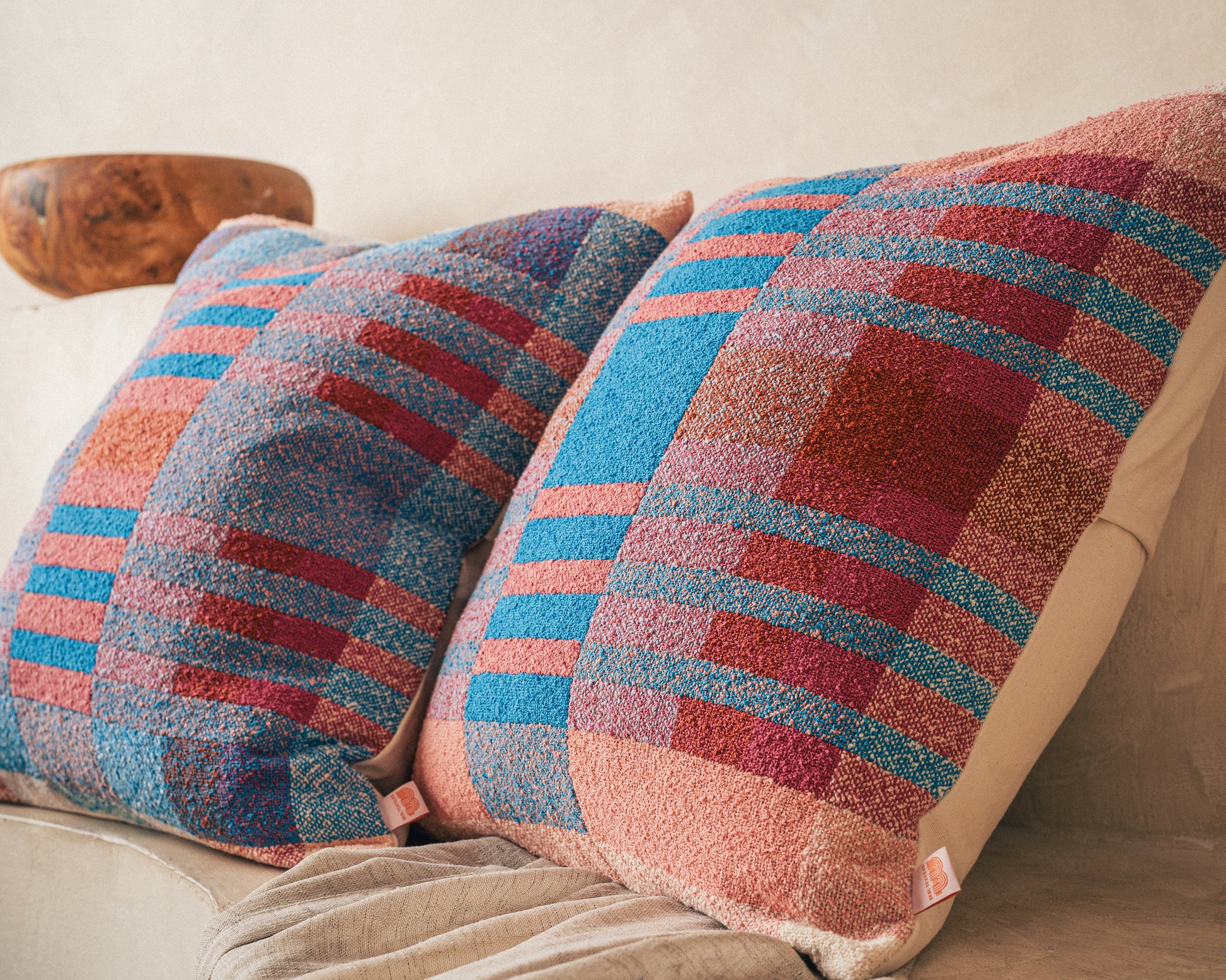 All pillow fronts are handwoven by Berly Sampson. Sewn together by Sew Co. Pillows are approximately 20x20 with a cream colored envelope backing.