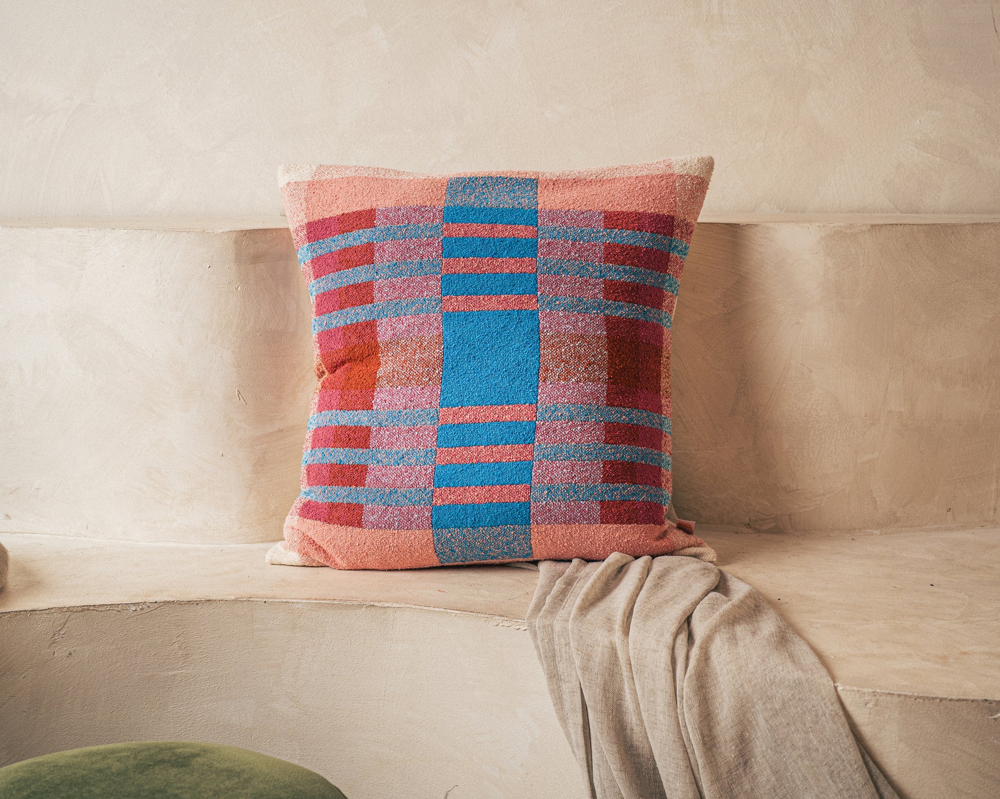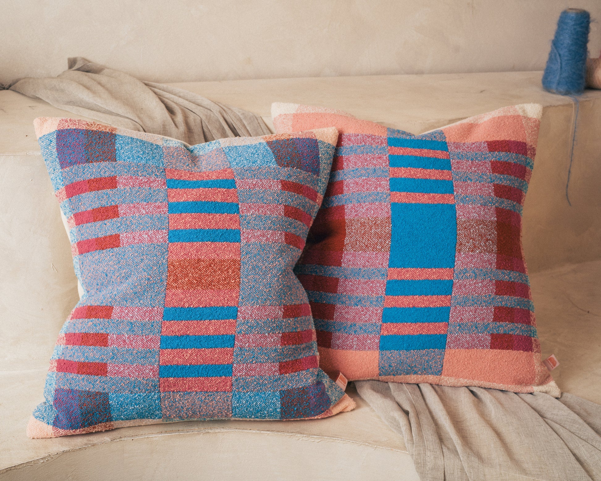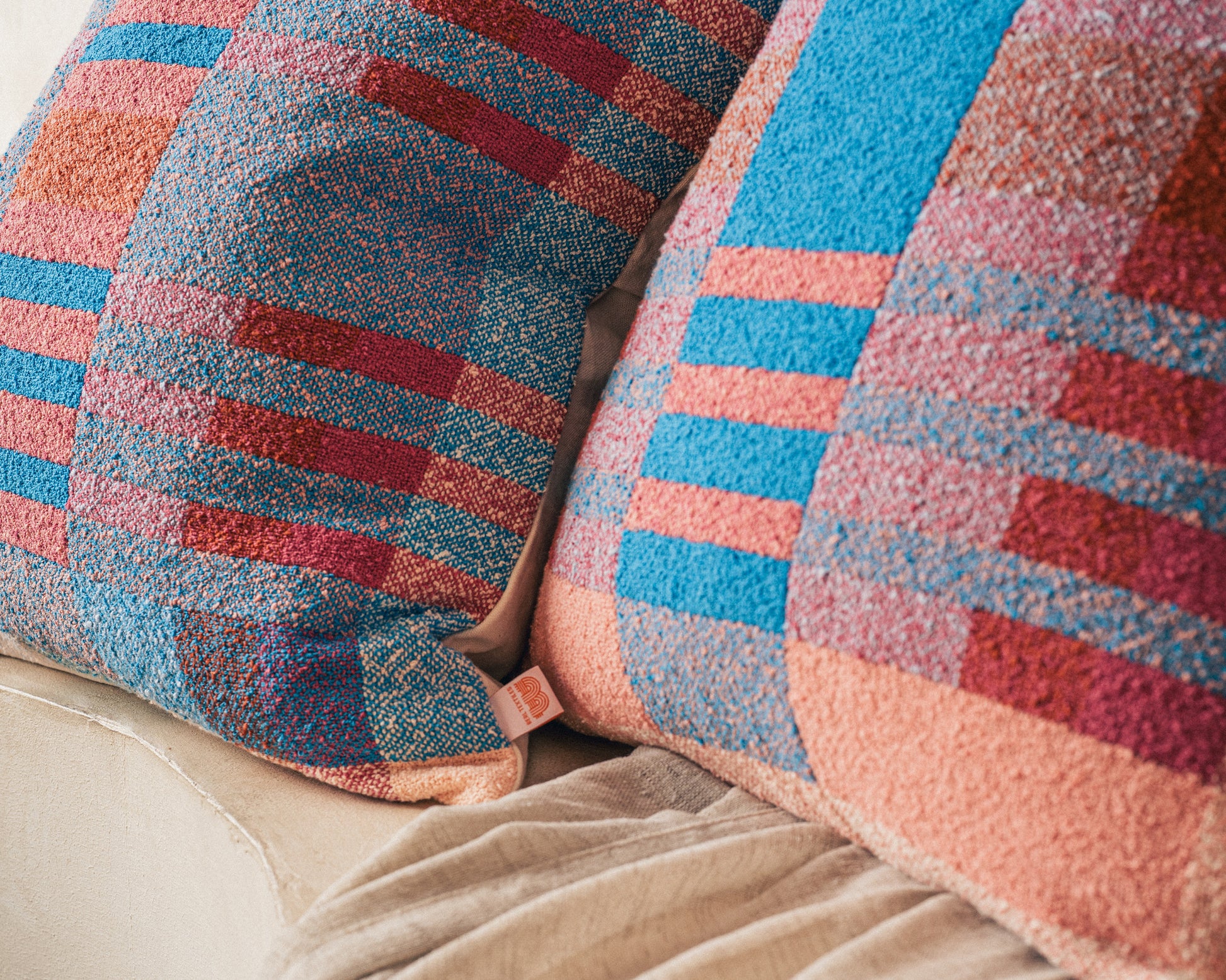 All pillow fronts are handwoven by Berly Sampson. Sewn together by Sew Co. Pillows are approximately 20x20 with a cream colored envelope backing.