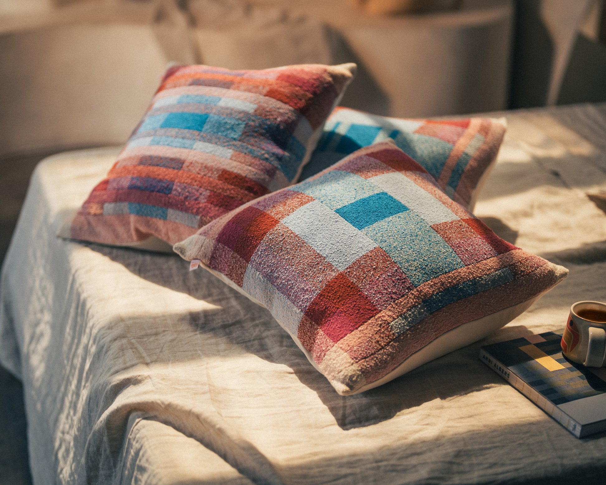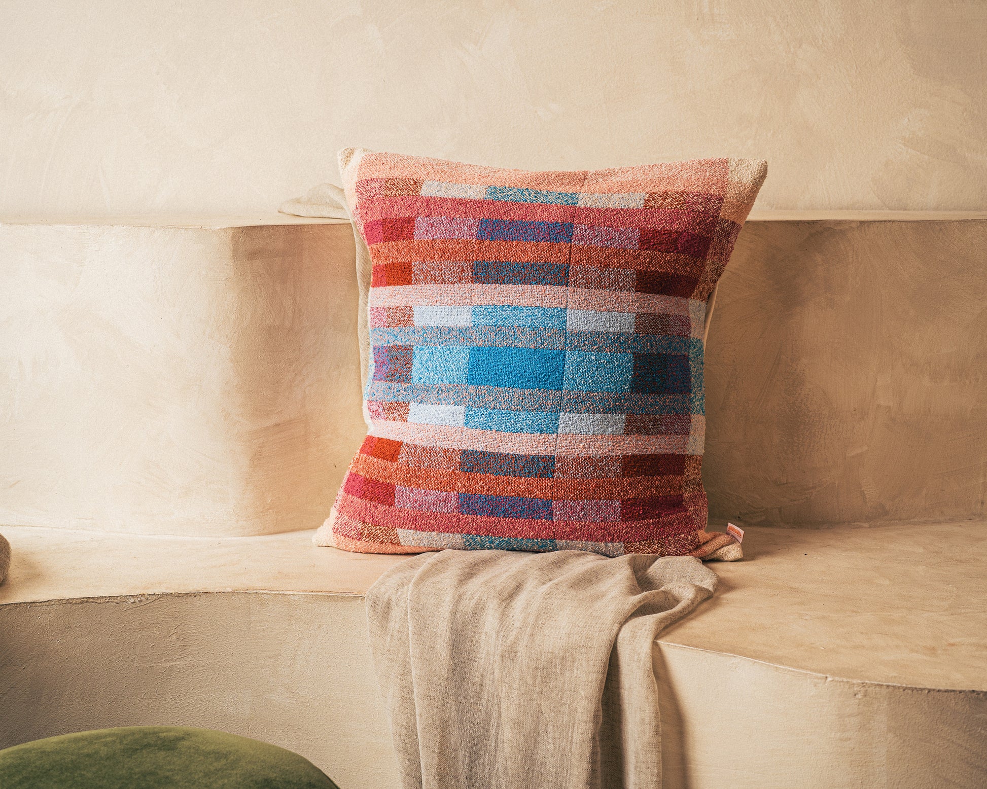 All pillow fronts are handwoven by Berly Sampson. Sewn together by Sew Co. Pillows are approximately 20x20 with a cream colored envelope backing.